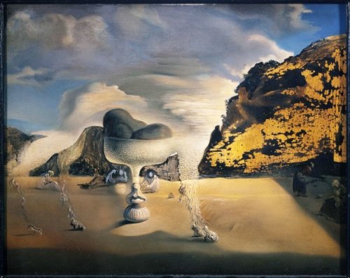 Te puede servir de ayuda la obra anterior de la que ha sacado la inspiración para crear esta "Afgano invisible con aparición, sobre la playa, del rostro de García Lorca, en forma de frutero con tres higos".